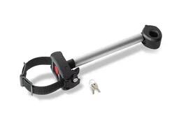 Der Abstandshalter kann bei geöffneter Schlinge schnell, einfach und ohne Werkzeug von dem Haltebügel des Trägers entfernt werden. Durch das Drücken der roten Sicherung um Gelenkkopf öffnet sich automatisch die Manschette zur Befestigung am Haltebügel. Durch eine abschließbare Ratsche kann der Greifarm verschlossen werden. Derartige Greifarme sind extrem flexibel, schonend und komfortabel. Es lassen sich auch sehr große Fahrradrahmen befestigen. Zudem können Beschädigungen am Fahrradrahmen ausgeschlossen werden. Die Schlinge fasst den Fahrradrahmen nie mit zu viel Druck. Brems- oder Leuchtenkabel werden nicht gequetscht oder zu stark auf den Fahrradrahmen gepresst und Karbonrahmen können nicht beschädigt werden. Der Rahmenhalter entspricht höchsten qualitativen Standards, entwickelt und Hergestellt von der Firma Uebler in Deutschland.